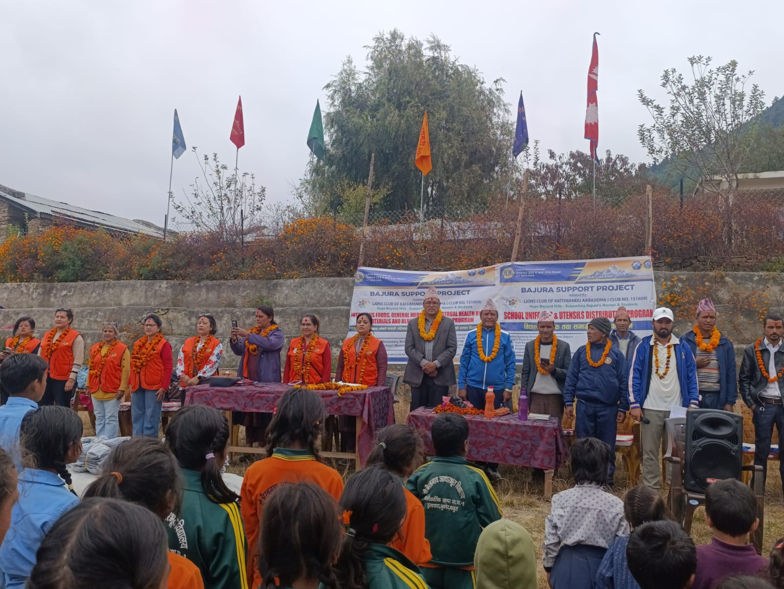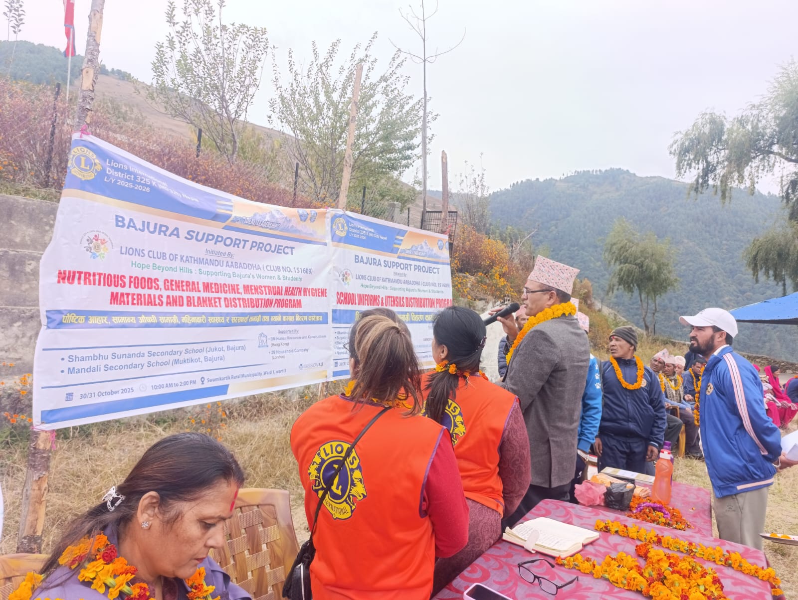 लायन्स क्लब अफ काठमाडौं आबद्ध (क्लब नं. १५१६०९) द्वारा “बाजुरा सपोर्ट प्रोजेक्ट” अन्तर्गत विद्यालय पोशाक तथा वितरण कार्यक्रम सम्पन्न गरिएको छ। “Hope Beyond Hills: Supporting Bajura’s Women & Students” भन्ने मूल नाराका साथ आयोजित यस कार्यक्रम अन्तर्गत बाजुरा जिल्ला स्वामिकार्तिक गाउपालिकाका विभिन्न विद्यालयका विद्यार्थीहरूलाई सहयोग सामग्री वितरण गर्ने लायन्स क्लबको उद्धेश्य देखिन्छ।