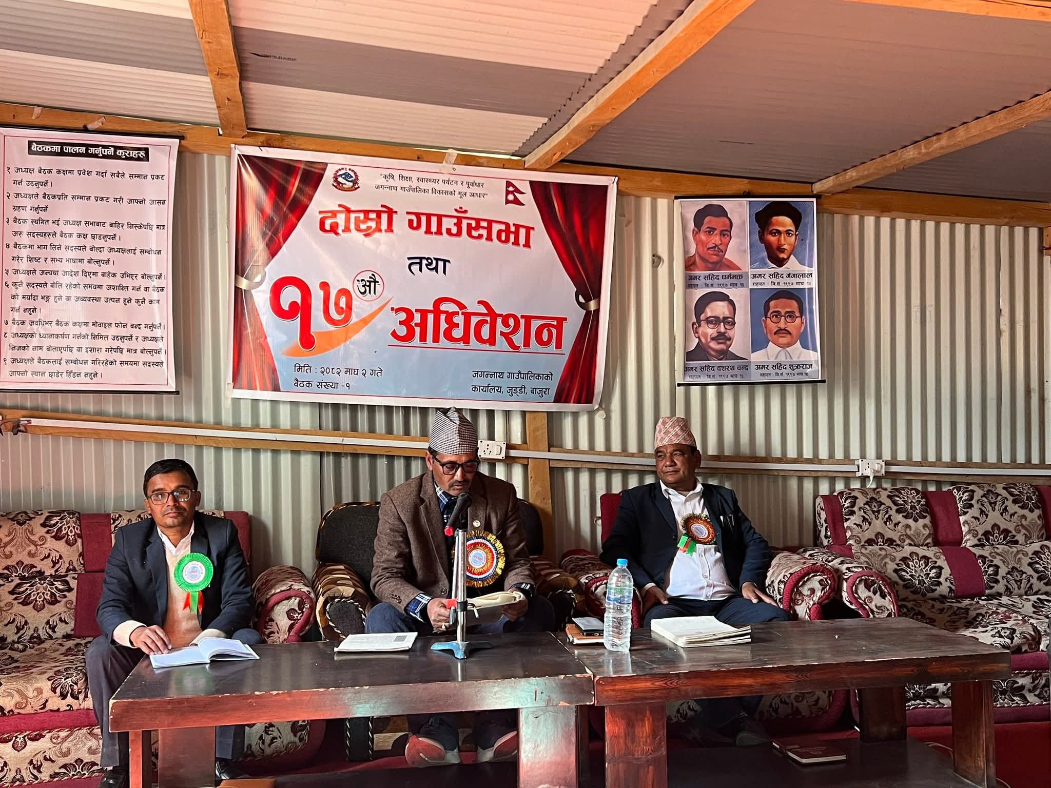 २माघ बाजुरा- जगन्नाथ गाउँपालिकाको दोस्रो गाउँसभा तथा १७ औं अधिवेशन सम्पन्न भएको छ । “कृषि, शिक्षा, स्वास्थ्य, पर्यटन र पूर्वाधार जगन्नाथ गाउँपालिका विकासको मूल आधार” भन्ने नाराका साथ गाउँपालिकाको केन्द्र जुड्डीमा संचालन भएको अधिवेशन सम्पन्न भएको छ ।