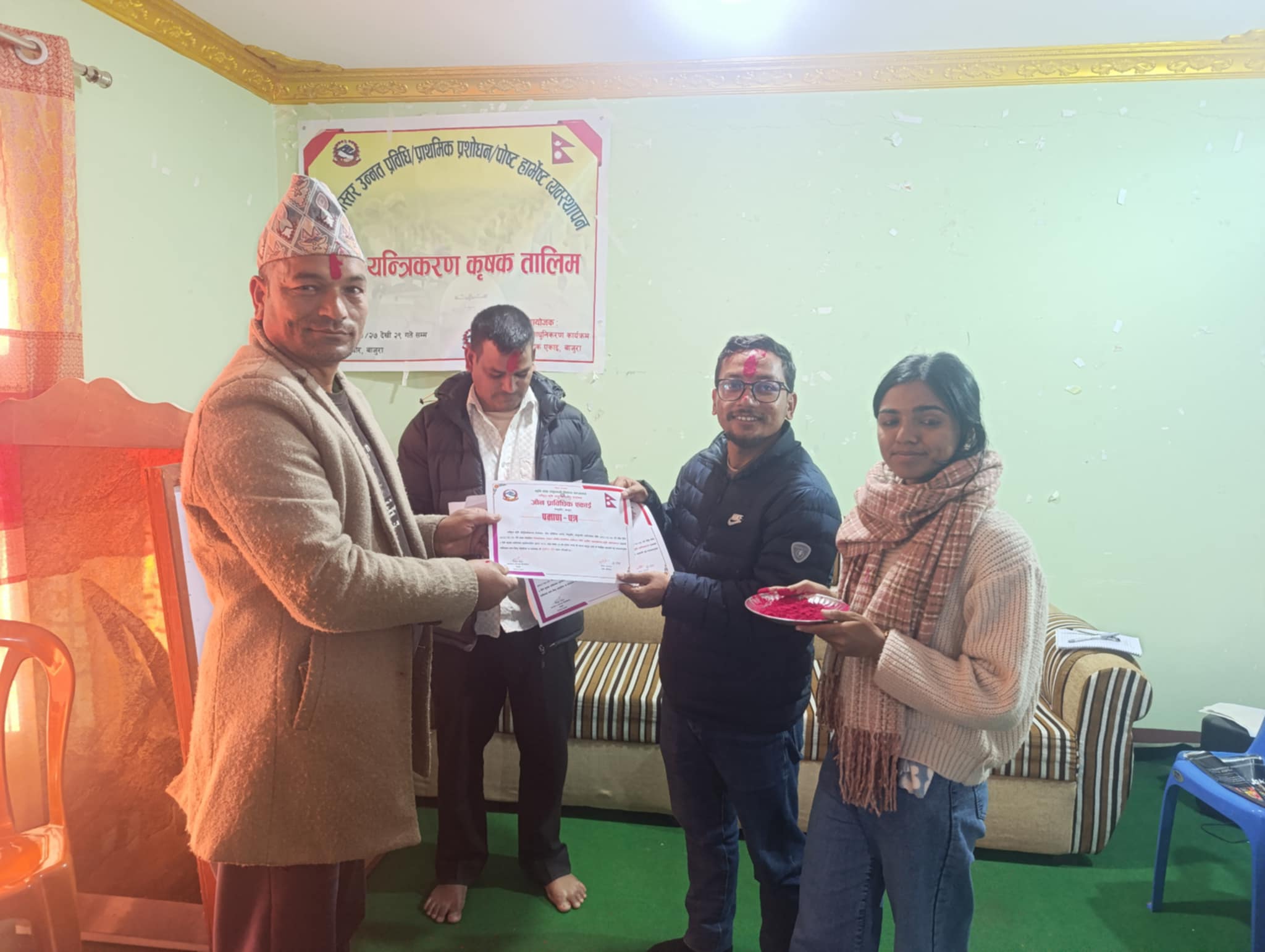 फल उत्पादनपछिको प्रविधि तथा पोष्ट हार्भेष्ट क्षतिन्यूनीकरण सम्बन्धी प्रशिक्षण शेरबहादुर केसीले दिनुभयो भने कृषि आधुनिकीकरण, कृषि यान्त्रिकरण र कृषि उद्यमशीलता विकास विषयमा कवि अवस्थीले प्रशिक्षण प्रदान गर्नुभयो।